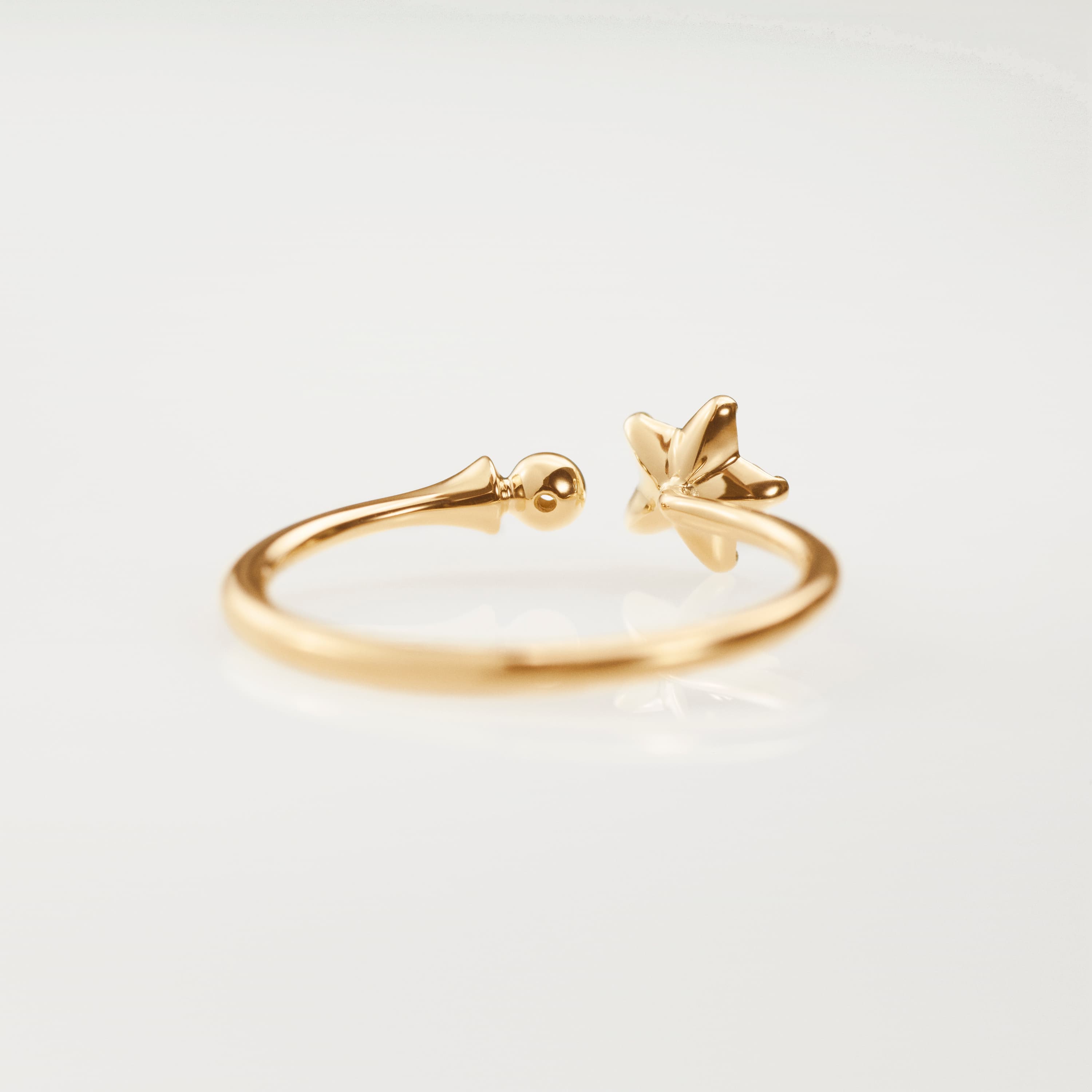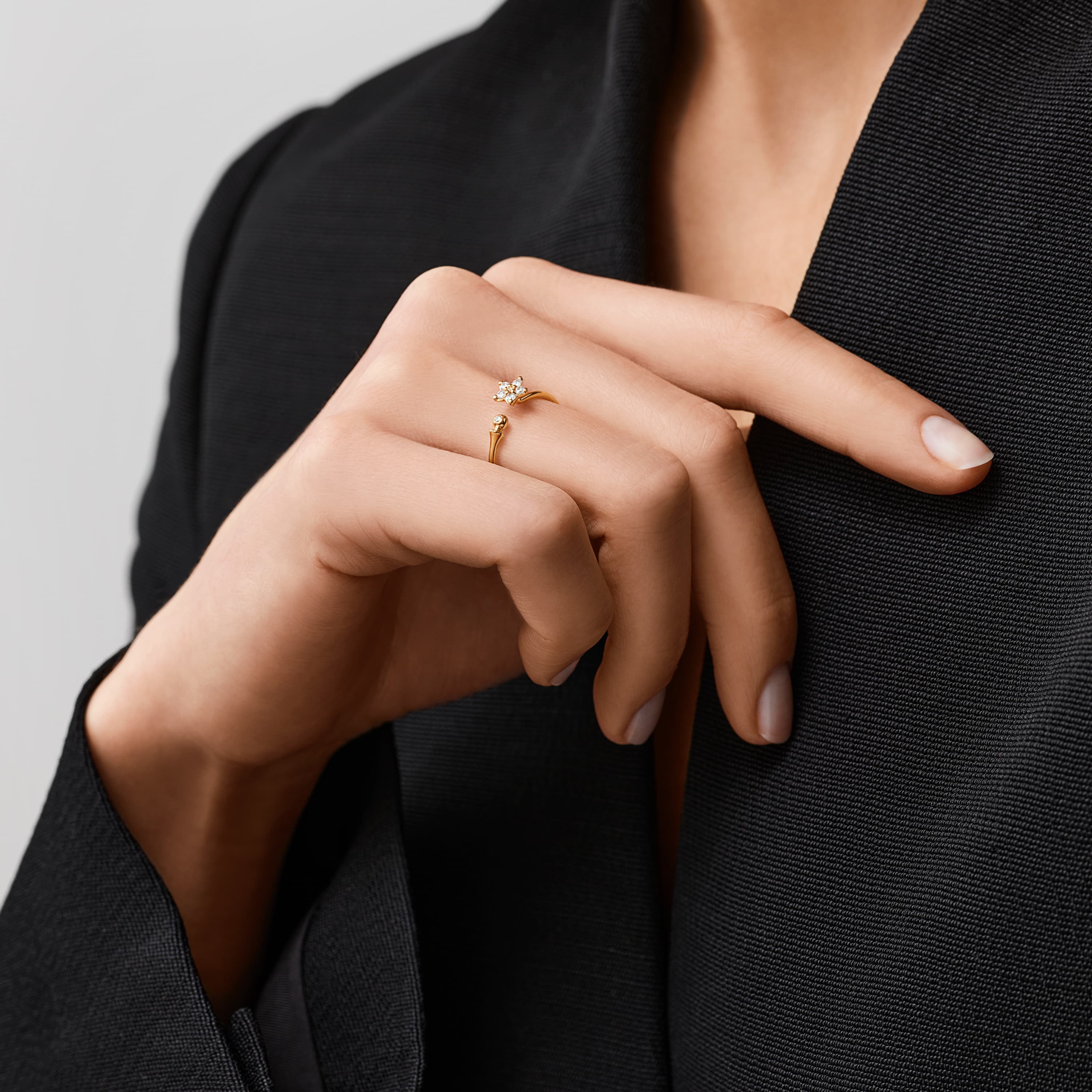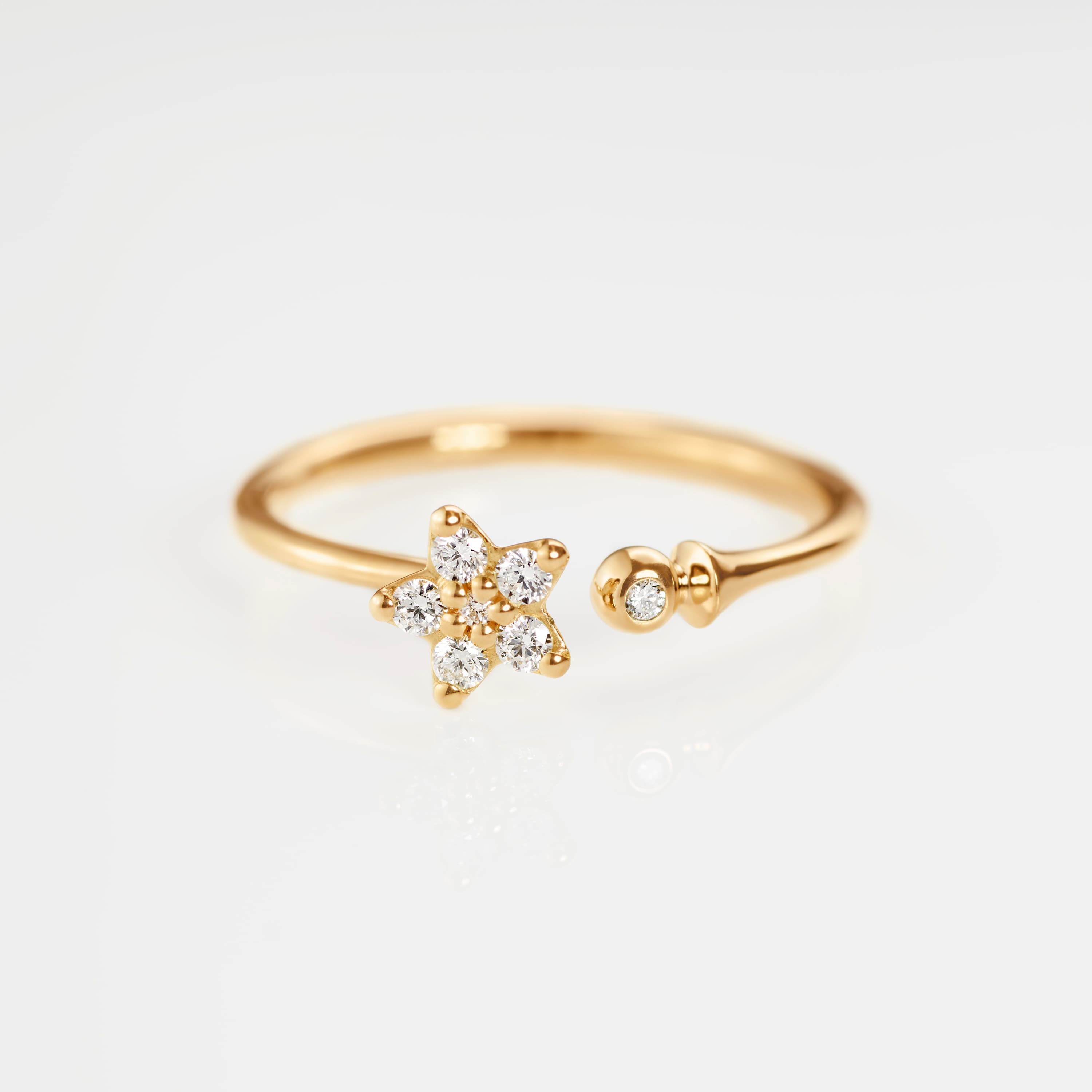 Designed by Charlotte Lynggaard, the Shooting Stars ring is crafted from 18 karat yellow gold and 7 diamonds totalling 0,11 carat TW. VS. The star comprises 6 brilliant cut diamonds, raised from the surface to allow light through the facets. The ring shank is slightly oval to enhance the delicate appearance of the ring, and the gold surfaces are hand-polished by master goldsmiths. Part of the Shooting Stars Collection.