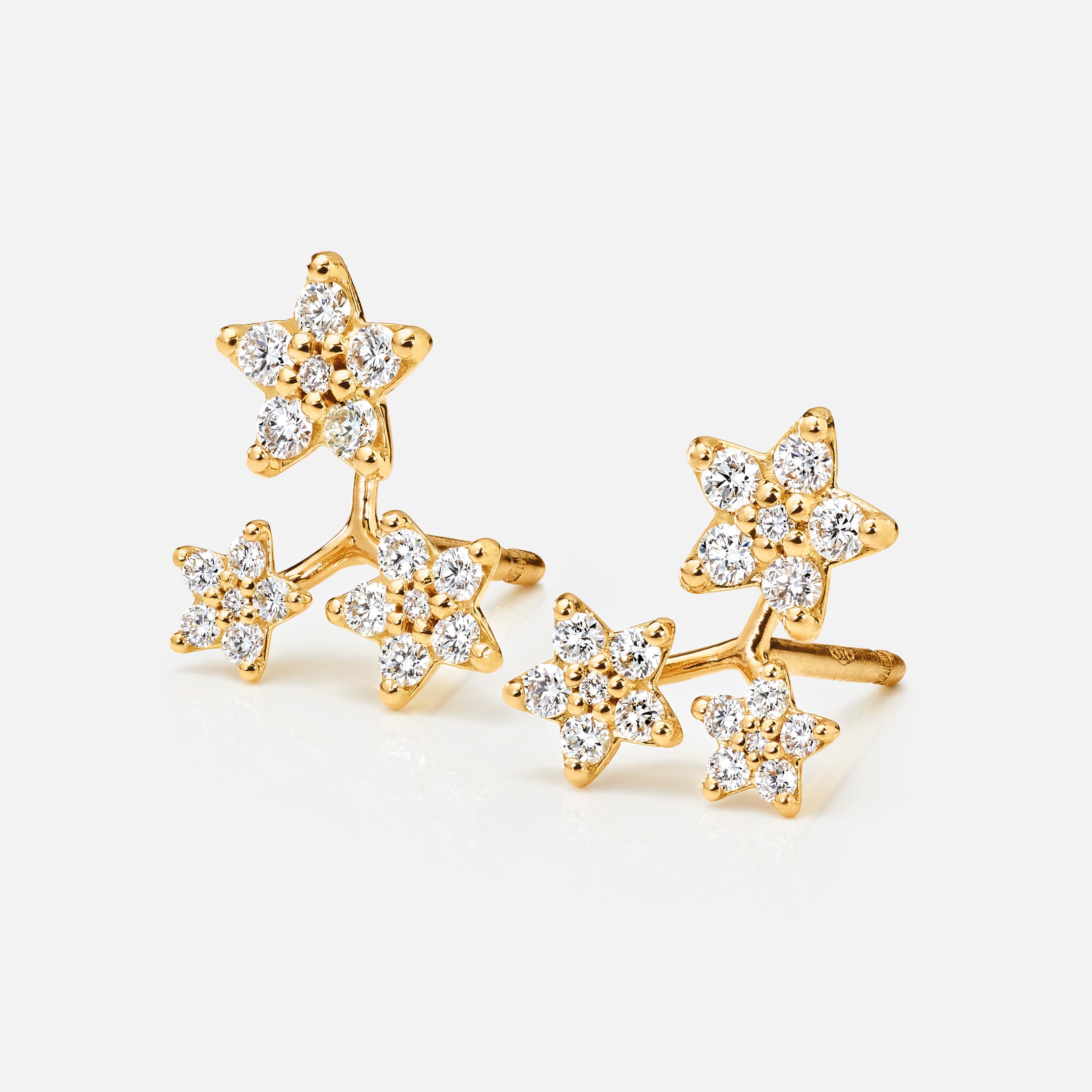 Designed by Charlotte Lynggaard, the Three Shooting Stars stud earrings are crafted from 18 karat yellow gold and 36 diamonds totalling 0.38 carat TW. VS. Each star has a slightly convex, hand-polished back and comprises 6 brilliant cut diamonds, raised from the surface to allow light through the facets. Master goldsmiths shape and polish the gold surfaces. Part of the Shooting Stars Collection. Sold as a pair.