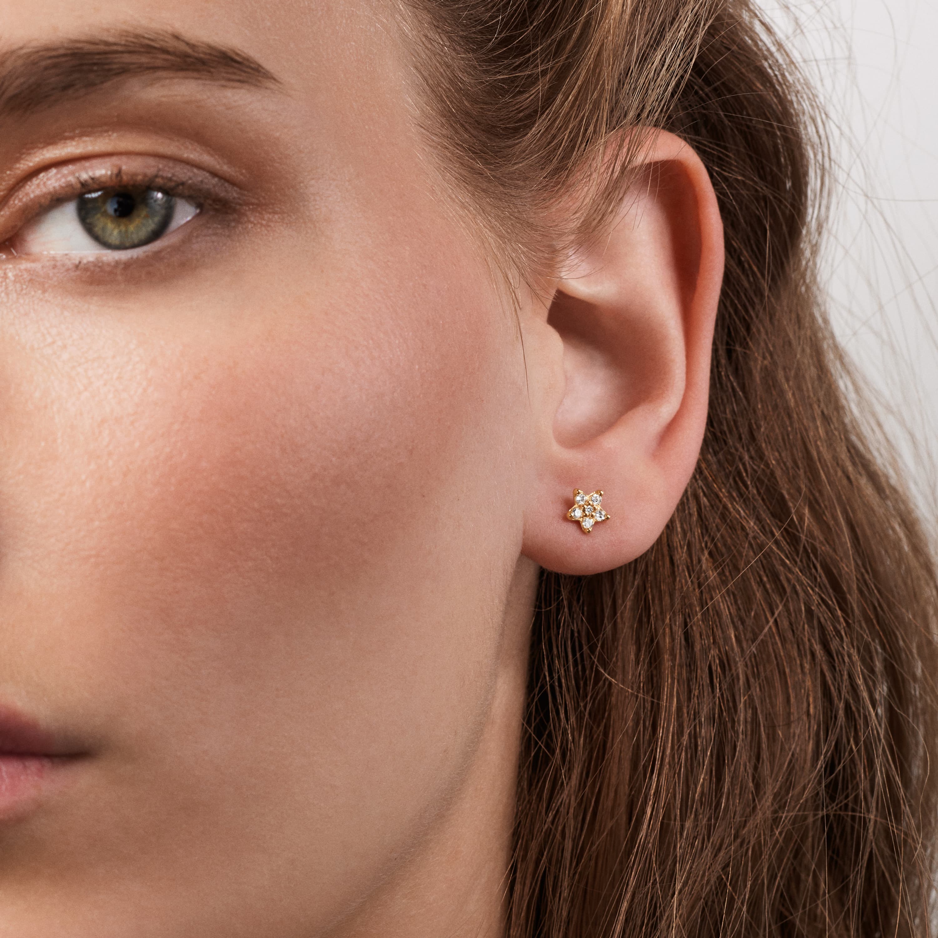 Designed by Charlotte Lynggaard, the Shooting Stars stud earrings small are crafted from 18 karat yellow gold and 12 diamonds totalling 0,21 carat TW. VS. Each 6 mm star has a slightly convex, hand-polished back and comprises 6 brilliant cut diamonds, raised from the surface to allow light through the facets. Handcrafted by master goldsmiths. Part of the Shooting Stars Collection.