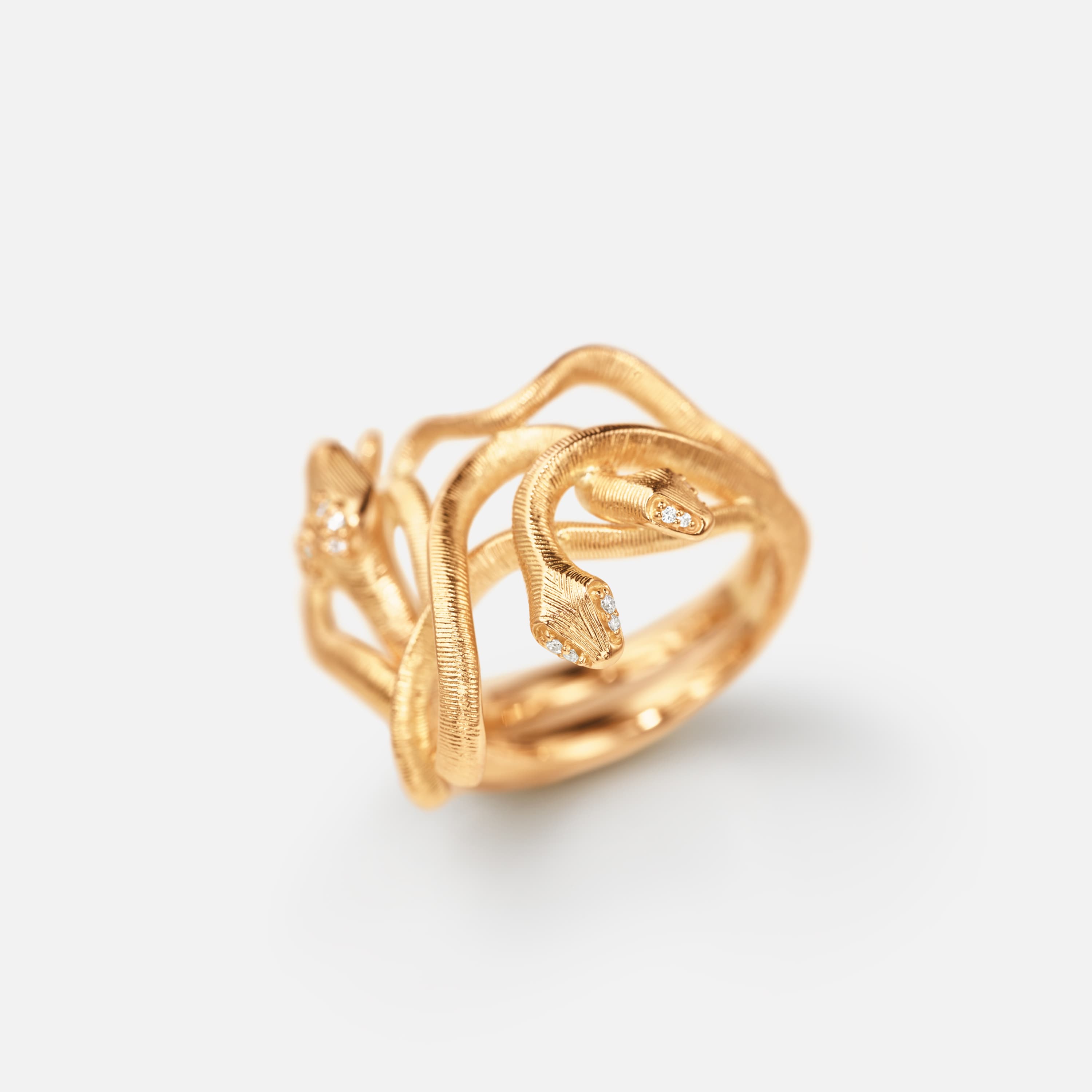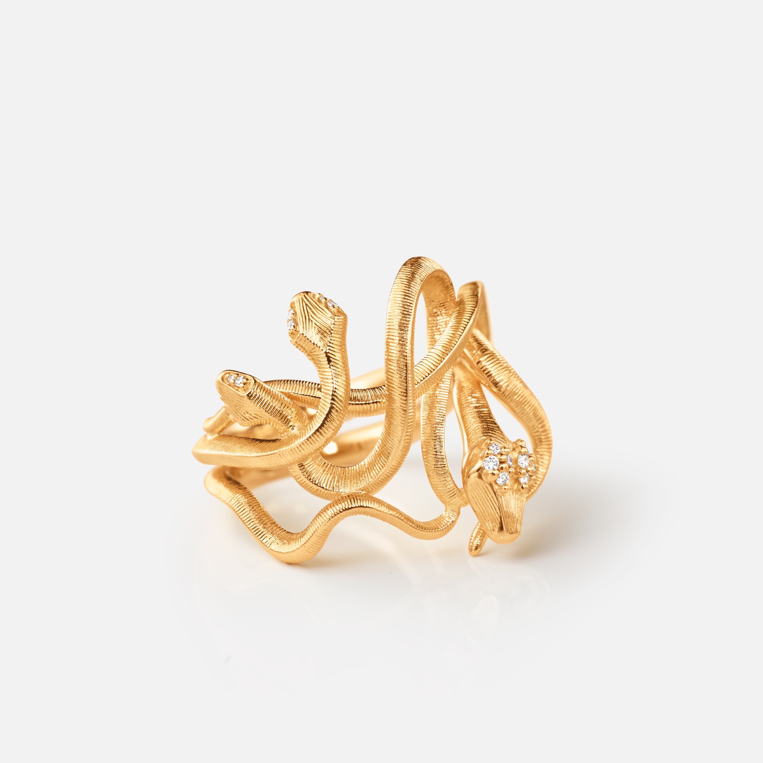 Designed by Charlotte & Ole Lynggaard, the Snakes Medusa ring is crafted from 18 karat yellow gold and set with 16 diamonds totalling 0.076 carat TW. VS. Handcrafted by master goldsmiths, the visible gold surfaces are hand-satinised, whilst the inside of the ring has a polished finish. Part of the Snakes Collection.