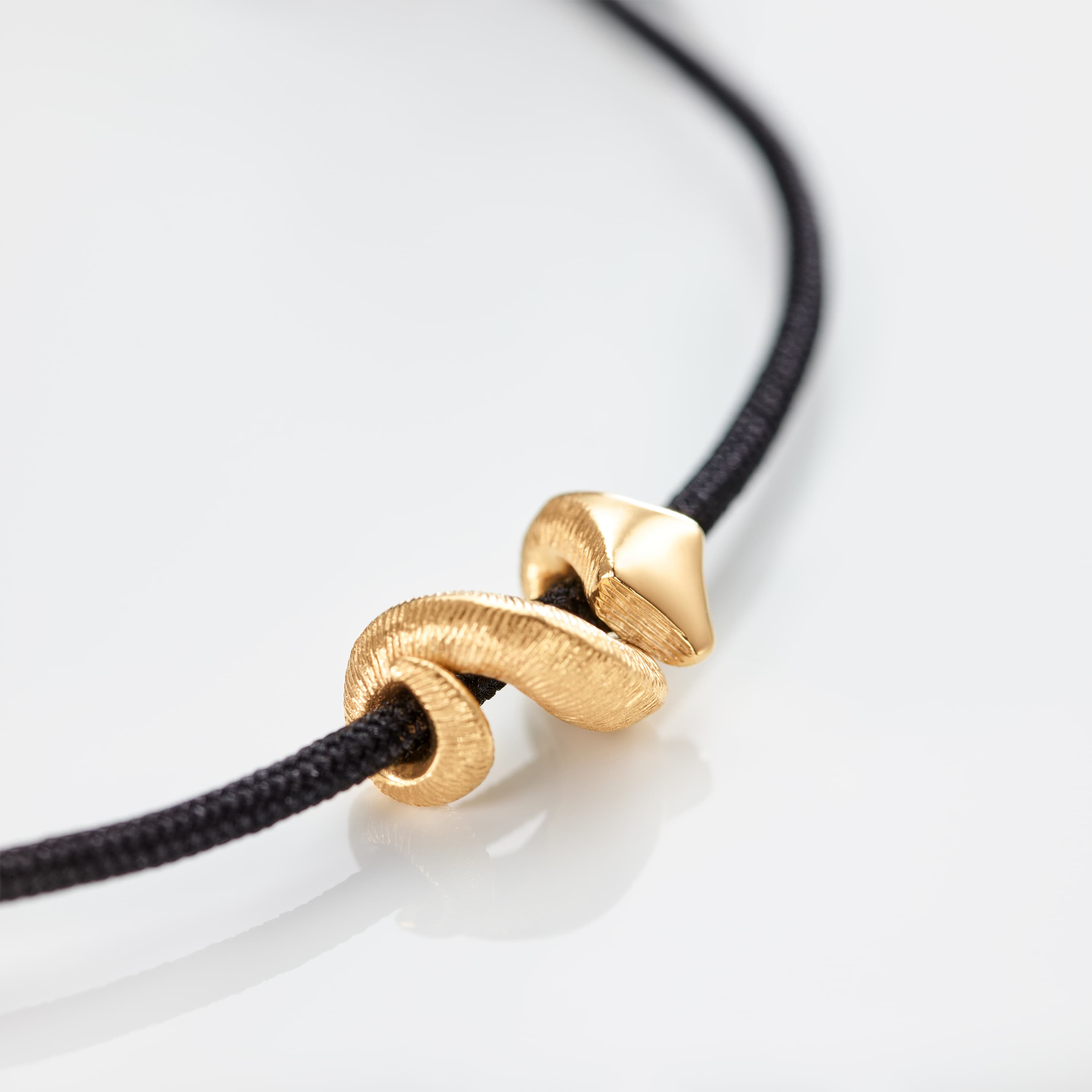 This Snakes bracelet features an 18 karat yellow gold snake charm, satinized by hand for a distinctive, textured finish. The charm is elegantly paired with a hand-knotted, black cord, composed by four string. The bracelet is adjustable in circumferenace, making it easy to take on and off. Designed by Ole and Charlotte Lynggaard. Part of The Snakes Collection.