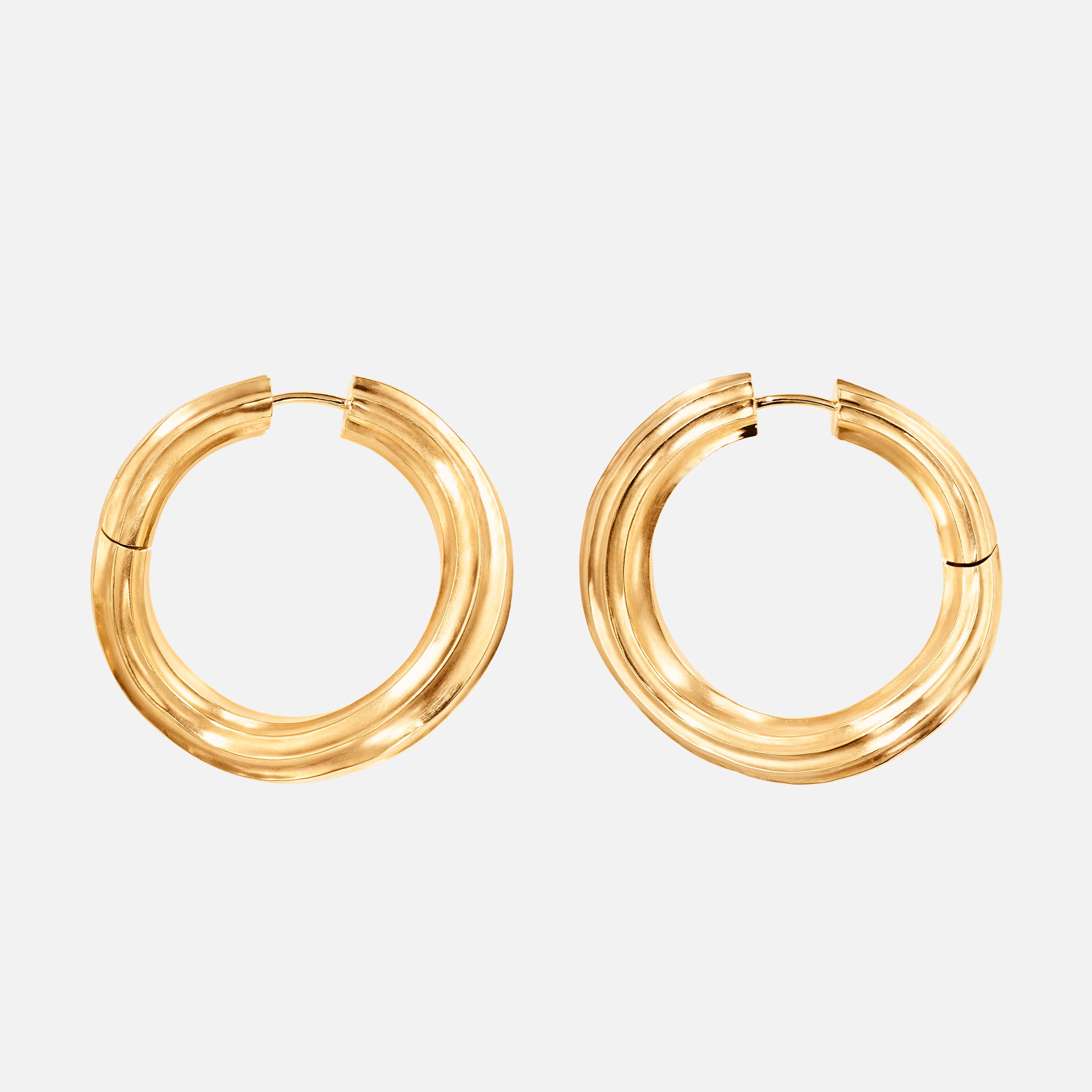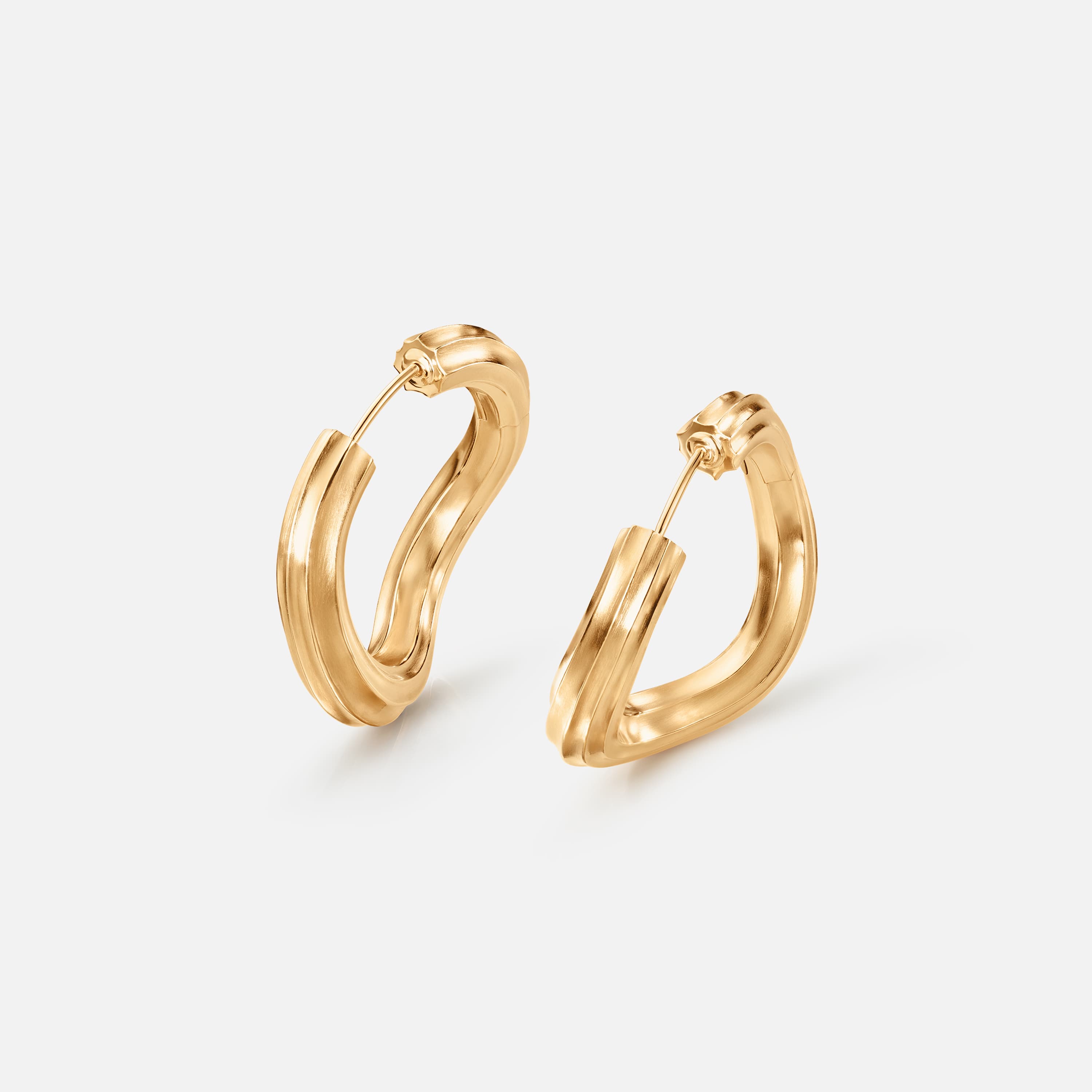 Designed by Sofia Lynggaard Normann. The lightweight hollow design is crafted from 18 karat yellow gold. The earrings are blending strength with comfort, echoing the sea's essence in endless, structured circuits. The shapes and surfaces of the design are inspired the organic movements of the ocean and structures in the sand. Part of the Under the Sea collection.