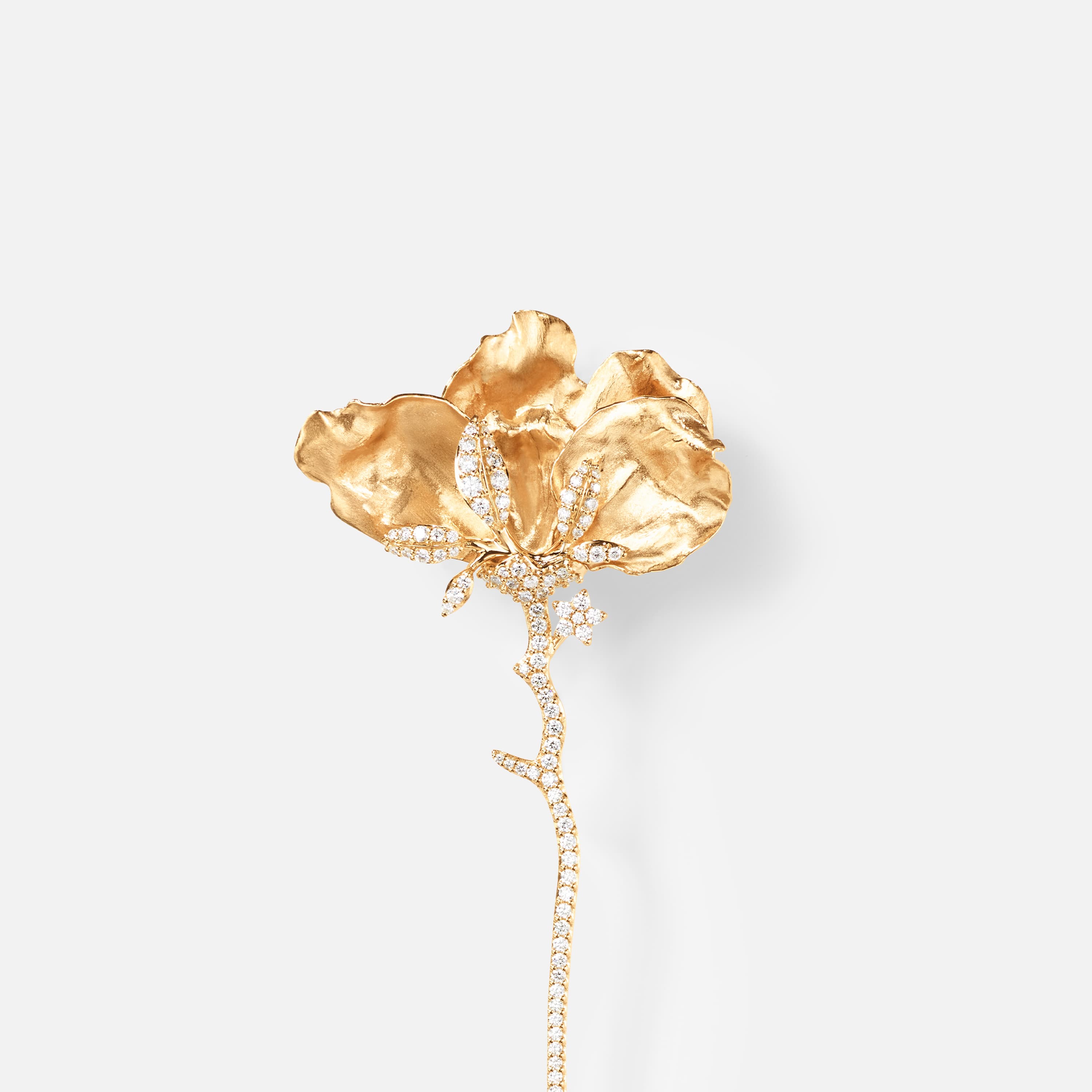 Designed by Charlotte Lynggaard, the Wild Rose brooch small is crafted from 18 karat yellow gold with a rose gold stem set with 96 diamonds totalling 0.67 carat TW. VS. Master goldsmiths carve and hammer the gold surfaces by hand, and polish the ridges to create contrast. Total length is 12 cm. Part of the Wild Rose Collection.
