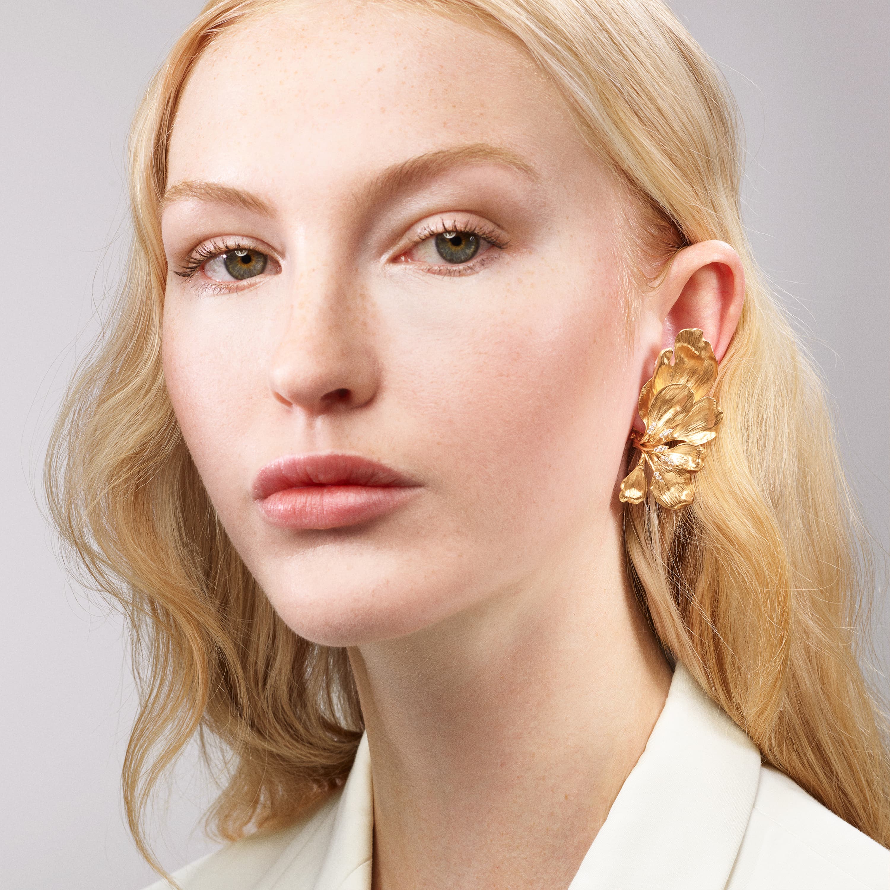 Designed by Charlotte Lynggaard, the Wild Rose earclips are crafted from 18 karat yellow gold with 40 diamonds totalling 0,28 carat TW. VS. Master goldsmiths carve and hammer the gold surfaces by hand, and polish the ridges to create contrast. Sold as a pair. Part of the Wild Rose Collection.