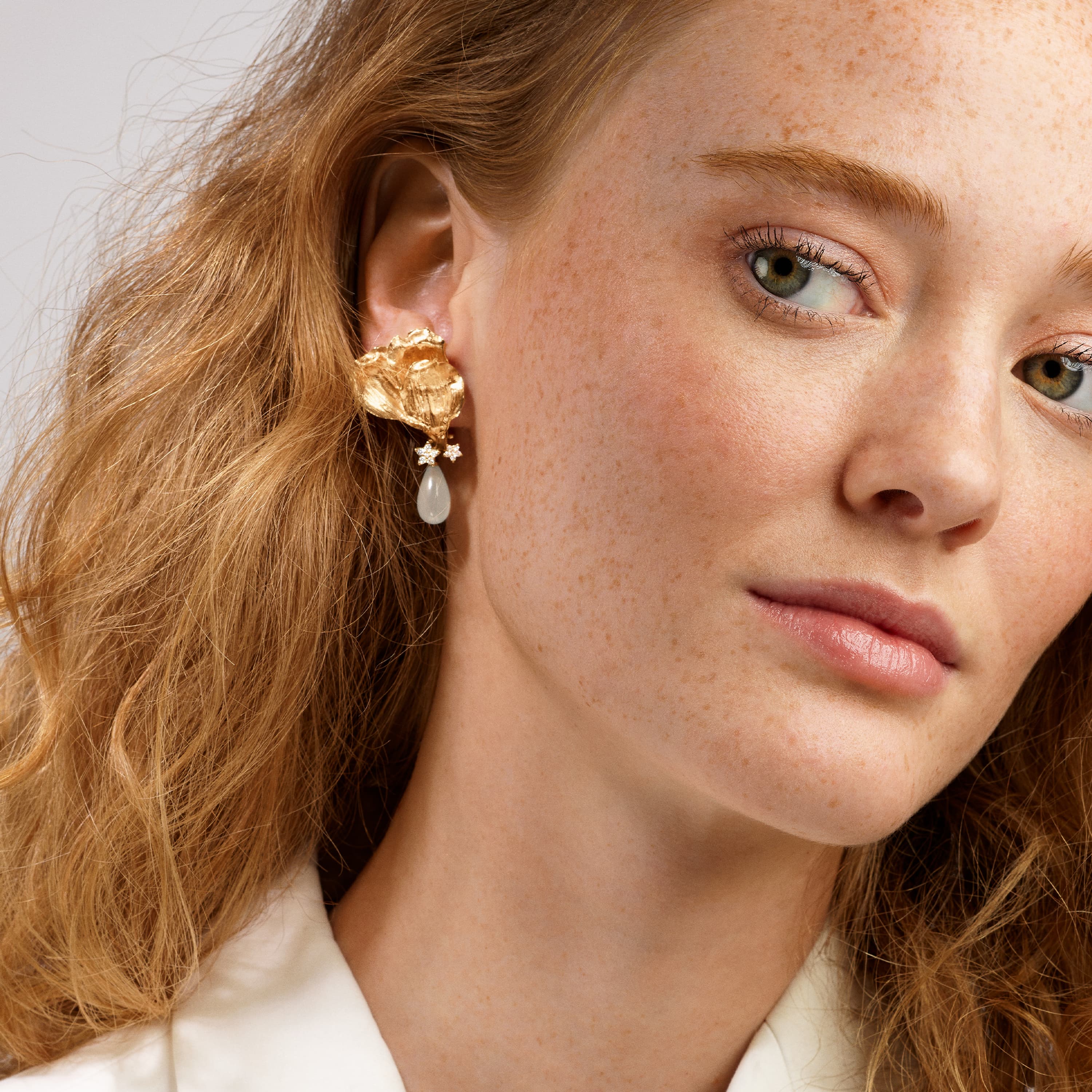 Designed by Charlotte Lynggaard, the Wild Rose Stars earclips are crafted from 18 karat yellow gold with 24 diamonds totalling 0.18 carat TW. VS. Master goldsmiths carve and hammer the gold surfaces by hand, and polish the ridges to create contrast. Sold as a pair. Part of the Wild Rose Collection.