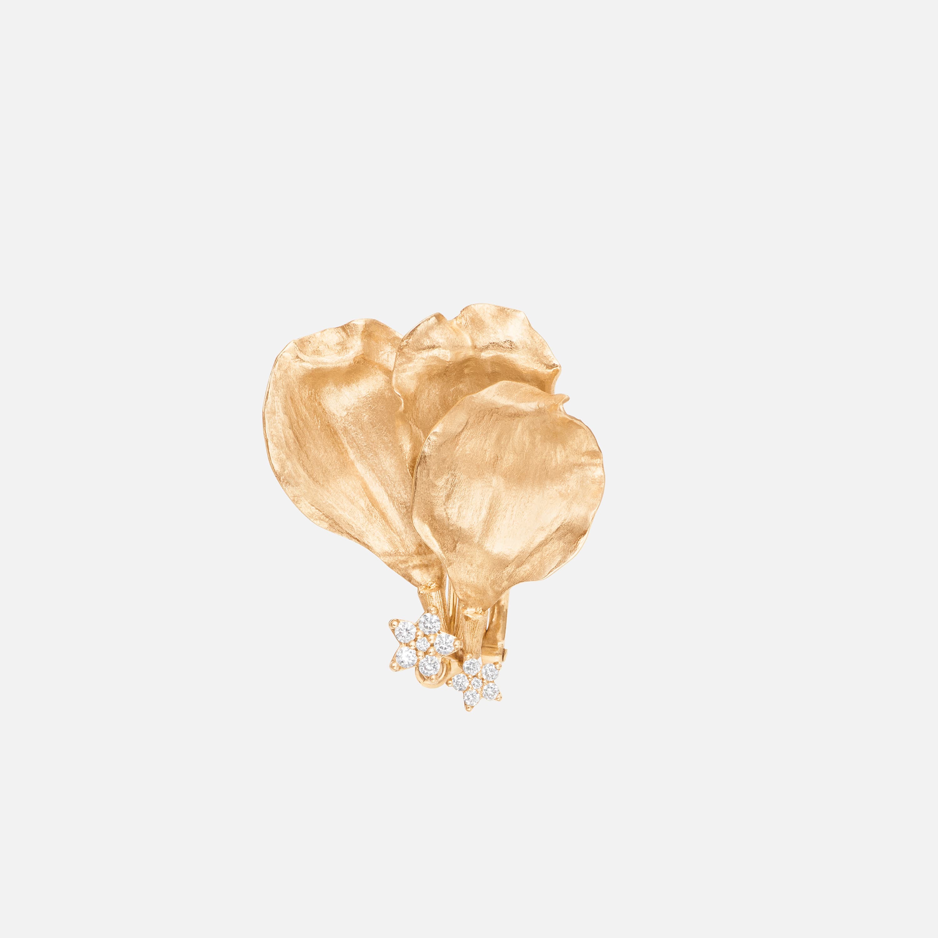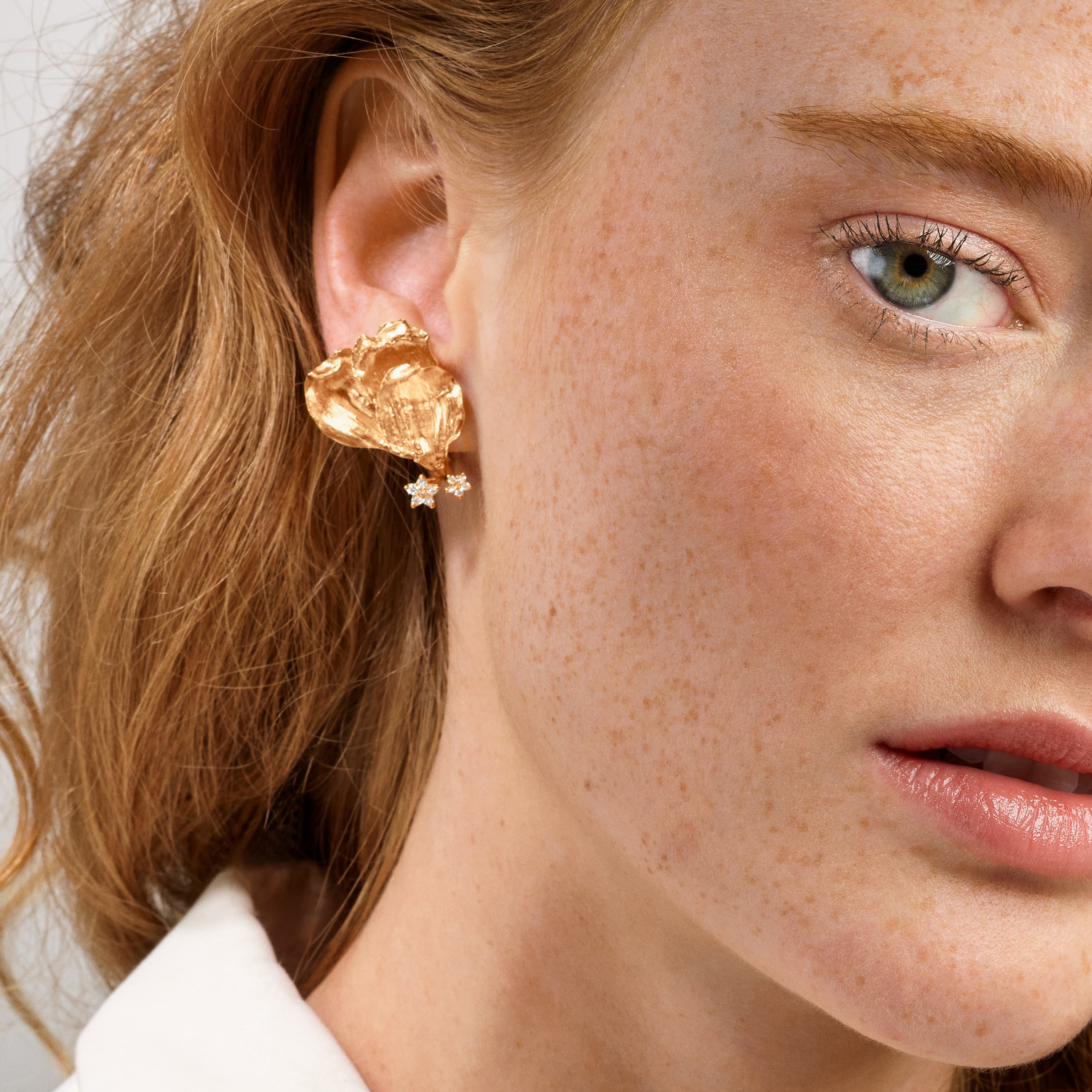 Designed by Charlotte Lynggaard, the Wild Rose Stars earclip is crafted from 18 karat yellow gold with 12 diamonds totalling 0,09 carat TW. VS. Master goldsmiths carve and hammer the gold surfaces by hand, and polish the ridges to create contrast. Sold as a single piece. Part of the Wild Rose Collection.